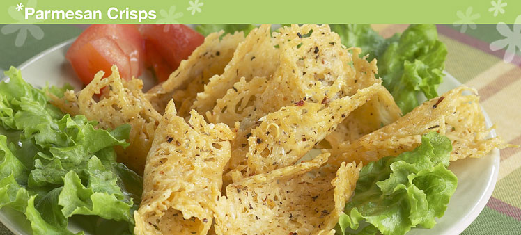 Preparation Time: 10 minutes Ingredients: 1 cup Parmesan cheese, grated ? tsp. Simple Indulgence? Italian Herb Mixed baby greens, for garnish Directions: Preheat oven to 350°F. Place cheese in Quick Shake® Container; add Simple Indulgence Italian Herb, seal and shake to mix together. Spoon tablespoons of cheese mixture onto a cookie sheet covered with Silicone Wonder Mat. Bake 6 at a time, 5-7 minutes until browned. Remove from oven and while wafers are still warm and pliable, hand shape as desired. Fill with baby greens. Nutrition Facts: Serving Size: 1/12 Recipe, Calories 40, Calories from fat 25, Total fat 2.5g, Saturated fat 1.5g, Trans fat 0g, Cholesterol 5mg, Sodium 180mg, Total Carbohydrate 1g, Dietary fiber 1g, Sugar 1g, Protein 4g E3 Tip: Crisps can be made in advance and stored at room temperature in Prep Essentials Snack-Stor® Container up to 5 days or may be frozen up to 2 months. Fill with baby greens before serving. |